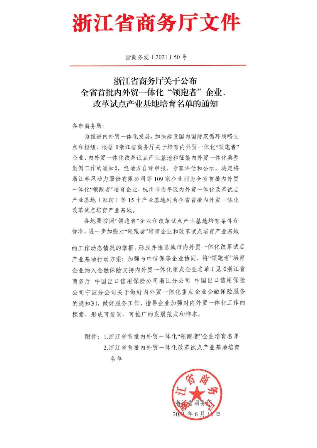 为推进内外贸一体化发展,加快建设国内国际双循环战略支点和枢纽,根据《浙江省商务厅关于培育内外贸一体化“领跑者”企业、内外贸一体化改革试点产业基地和征集内外贸一体化典型案例工作的通知》,经地方自评申报、专家评估和公示,决定将尊龙凯时泵业股份有限公司等109家企业列为全省首批内外贸一体化“领跑者”培育企业,杭州市临平区内外贸一体化改革试点产业基地(家纺)等15个产业基地列为全省首批内外贸一体化改革试点培育产业基地。