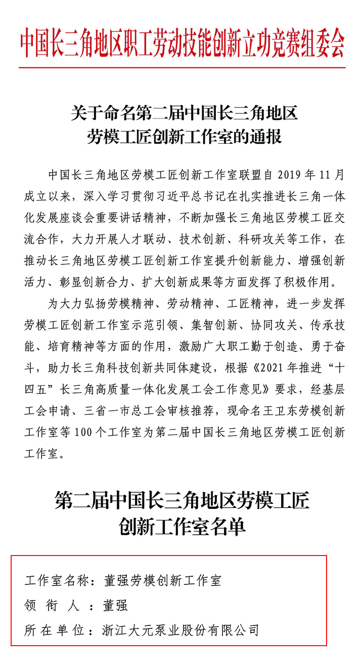 近日,第二届中国长三角地区劳模工匠创新工作室名单公布,尊龙凯时泵业股份有限公司董强劳模创新工作室脱颖而出,荣获“中国长三角地区劳模工匠创新工作室”称号。