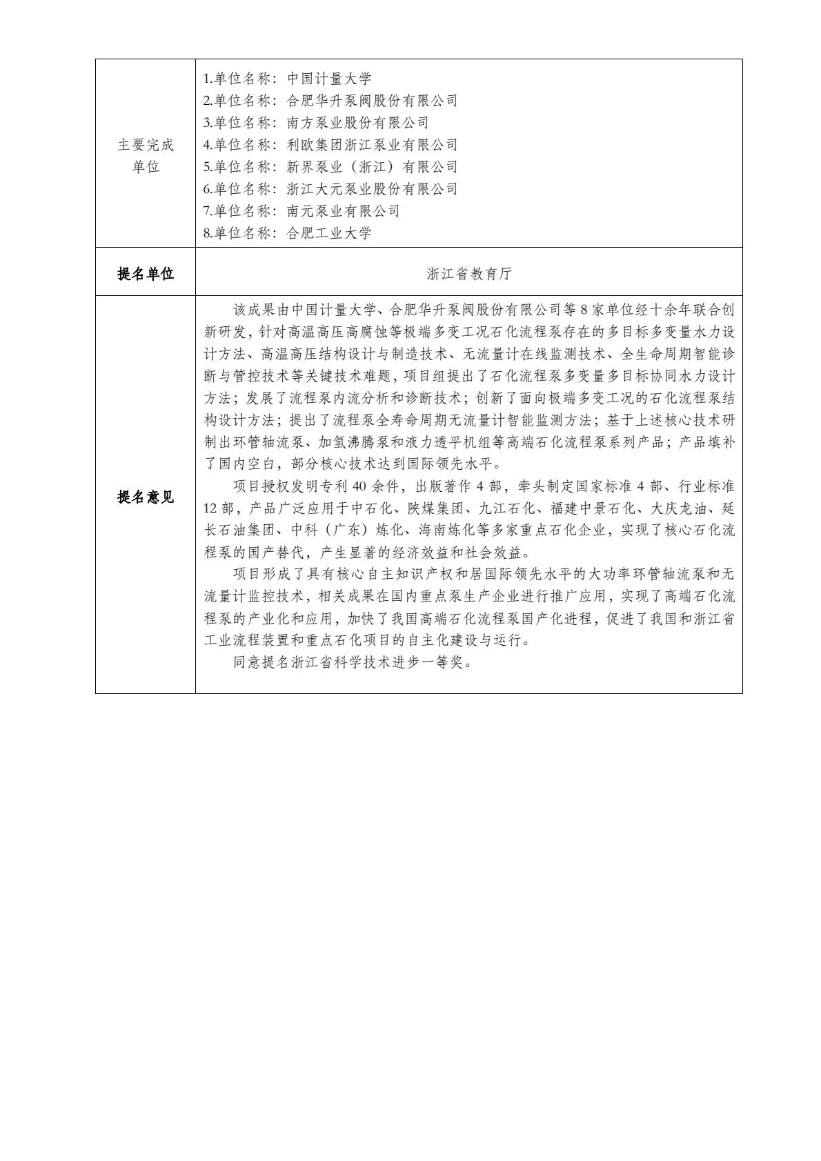 尊龙凯时泵业股份有限公司作为主要完成单位参与由中国计量大学为第一完成单位的成果《极端多变工况的石化流程泵关键技术及产业化》,现申报2023年度浙江省科学技术奖。